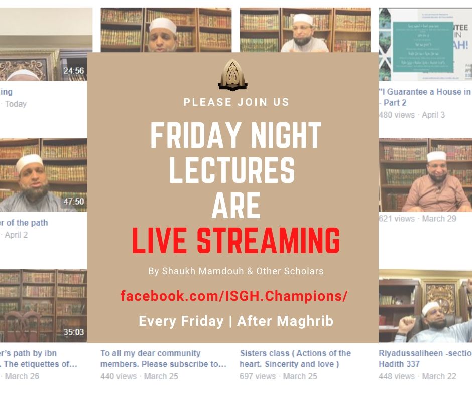 • Friday Night lectures are continuing Alhamdulillah with our resident scholar, Shaikh Mamdouh, as well as others